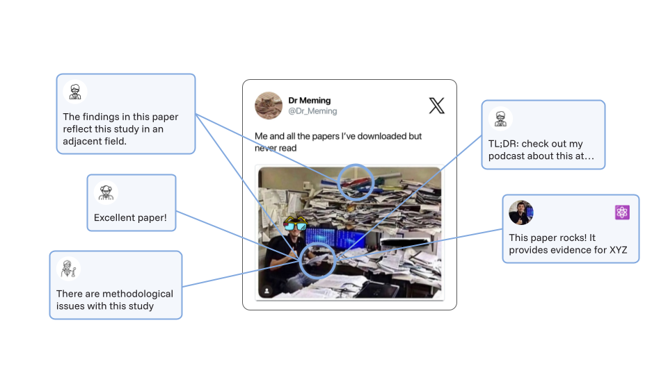 The social nature of attention is also attested to by the widespread use of social media by researchers. Ask a researcher how they find interesting papers to read, and more often than not, social media figures largely in their answer. And yet, social media is not designed for science; research content is buried in noisy feeds, platforms optimize for engagement and not sensemaking, data is siloed and fragmented, and the medium is not expressive enough for complex knowledge work. Despite its limitations, social media provides an important clue towards how we can overcome information overload.