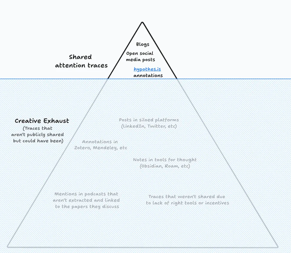 Classic examples of attention artifacts are notes or annotations in personal knowledge tools like Obsidian, Notion or Zotero. Sometimes there may be no material "attention traces" - perhaps a paper wasn't worth finishing or taking notes on. And obviously, in some cases insights will be kept private. But more and more researchers are sharing insights publicly, for example as posts on social media recommending or critiquing something they recently read.