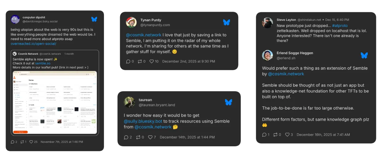 Launching Semble has given us early evidence for a hypothesis we've long been excited to test: that the right interfaces can harness valuable"creative exhaust"—the thoughts, connections, and references that researchers generate but rarely share publicly. Semble also makes space for new kinds of knowledge creators—for example, we are noticing people who are quiet on Bluesky but who curate fascinating content on Semble.