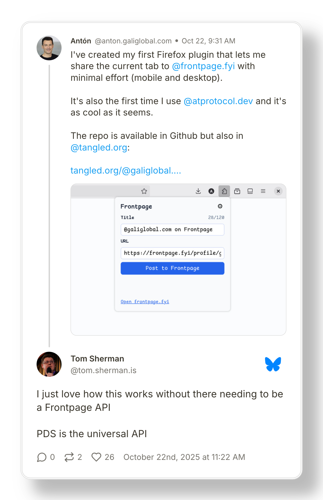 Or as Dan Abramov puts it in Open Social, "The protocol is the API.” Exciting stuff!